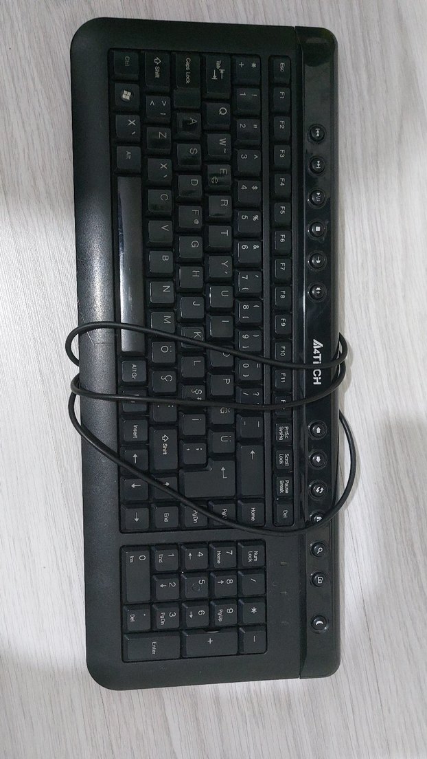 Sayısal tuş takımı ve ek fonksiyon tuşları bulunan siyah kablolu A4Tech klavye. Standart QWERTY düzeninde ve multimedya tuşlarına sahip.⌨️ Ara sıra temassızlık yapmaktadır, 10 parmak alıştırması -montesori eğitimi- yedek harf için kullanılabilir.