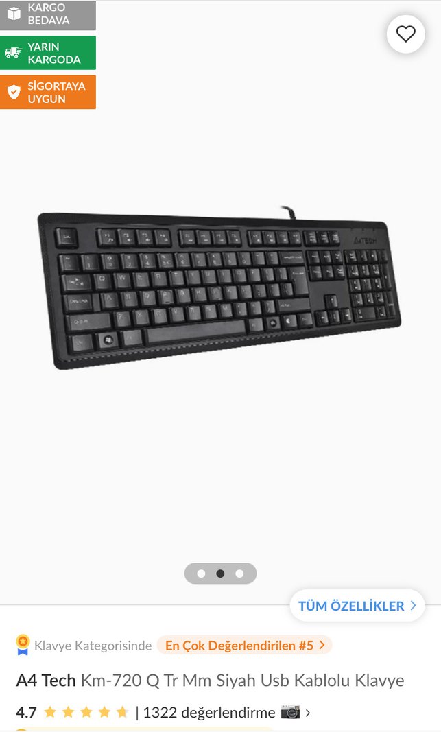 Tam tuş düzenine sahip siyah kablolu klavye. Sigortaya uygun ve klavye kategorisinde çokça değerlendirilen bir ürün.⌨️ A4tech km-720 klavye Q