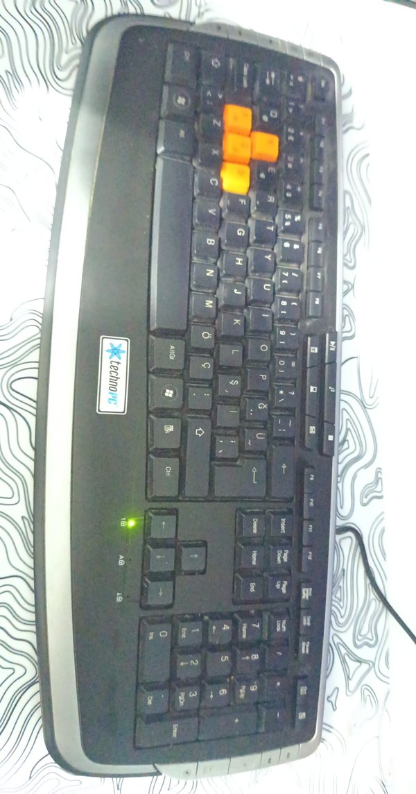 Turuncu bazı tuşlara sahip siyah kablolu klavye, sayısal tuş takımı ve gösterge ışıkları içerir. Üzerinde 'TechnoNet' etiketi bulunur. ⌨️