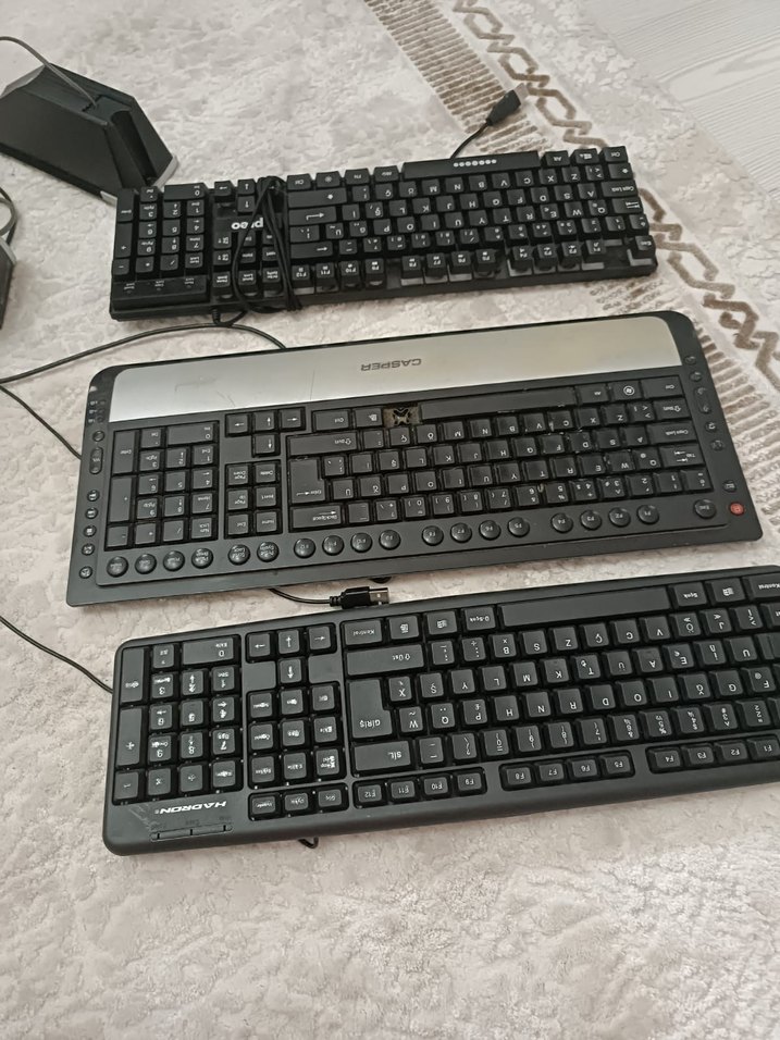 Sayısal tuş takımlı, tam tuş düzenine sahip üç siyah kablolu klavye seti. ️