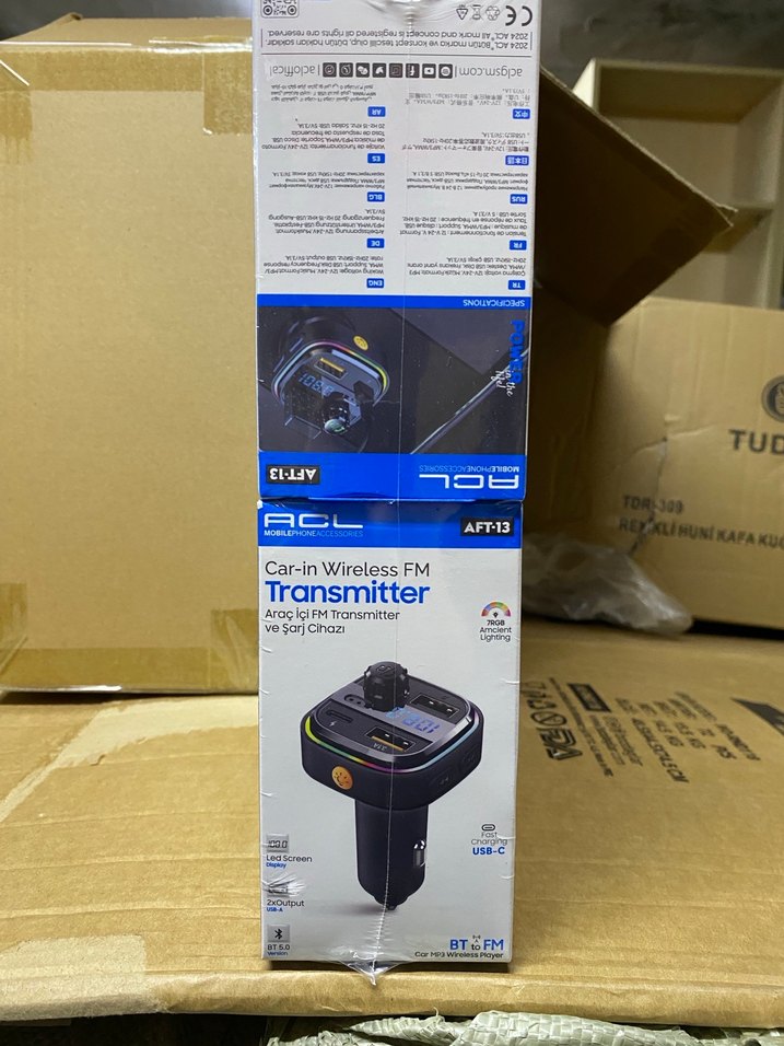 Siyah kablosuz FM verici, Bluetooth bağlantısı ve USB-C şarj desteği sunar. Eller serbest arama ve müzik akışı sağlar. Kompakt ve kullanımı kolay.