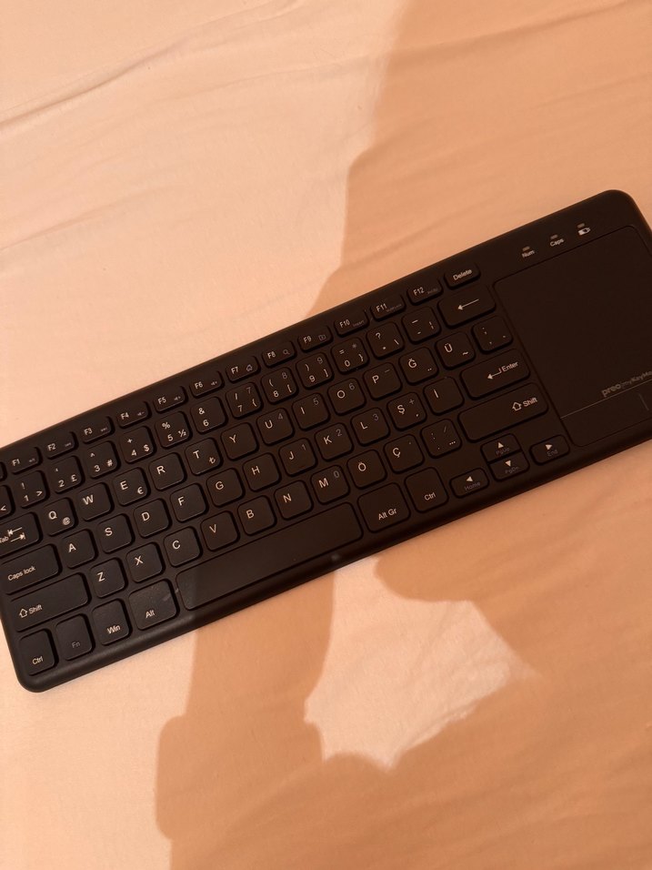 Siyah kablosuz klavye, entegre touchpad ile kompakt tasarım ve rahat kullanım sağlar. ️