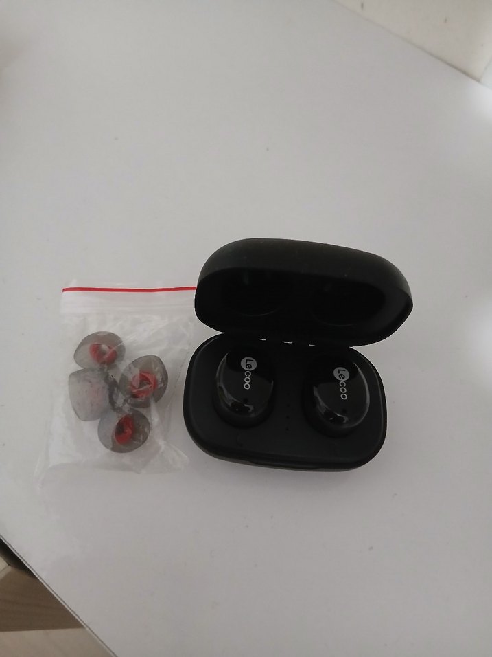 Kompakt şarj kutulu siyah kablosuz kulak içi kulaklık, ekstra kulak uçları ile birlikte.
