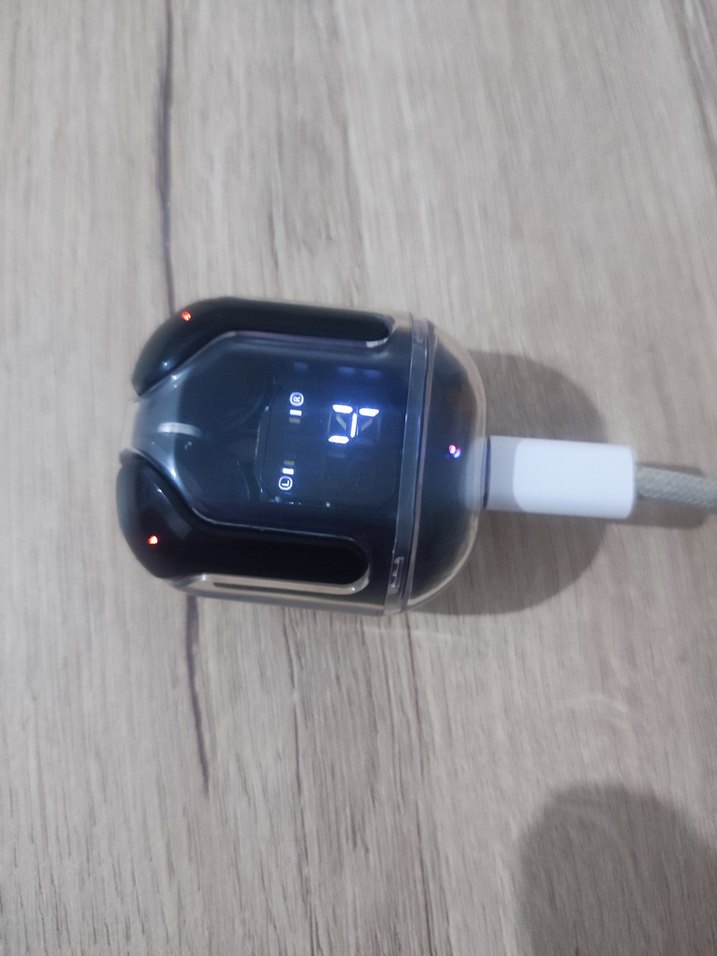 Dijital ekranlı şarj kutusunda pil durumu gösteren siyah kablosuz kulaklıklar.
