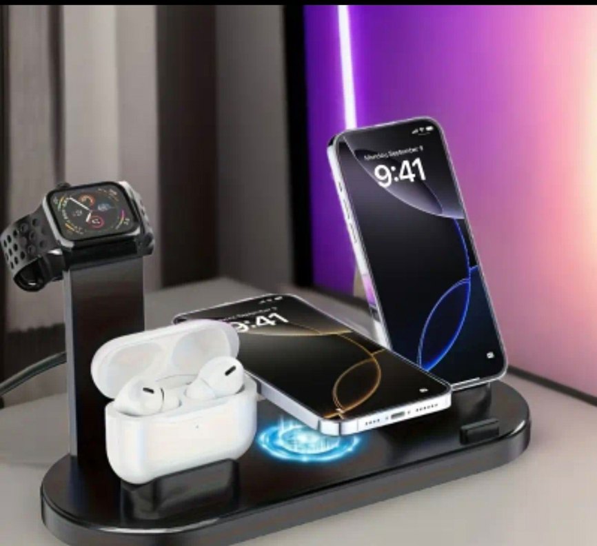 Siyah kablosuz kulaklıklar, şarj kutusu ve akıllı telefon ile akıllı saat uyumlu şarj istasyonu ile birlikte gelir. Ekranda 9:41 gösterilmektedir.