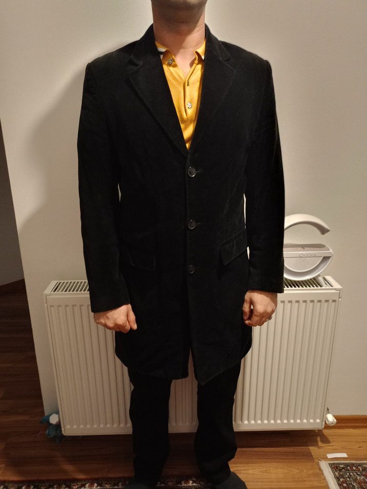 Siyah kadife kumaştan yapılmış, düğmeli, normal boy midi erkek kaban. Notch yaka ve uzun kolludur, iş ve günlük şıklık için uygundur.