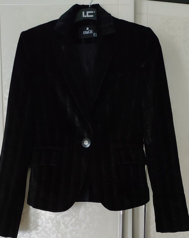 Siyah kadife kumaştan, düğmeli ve normal kesim uzun kollu kadın blazer ceket. Ofis için uygun, klasik gotik tarzda.marka temsili