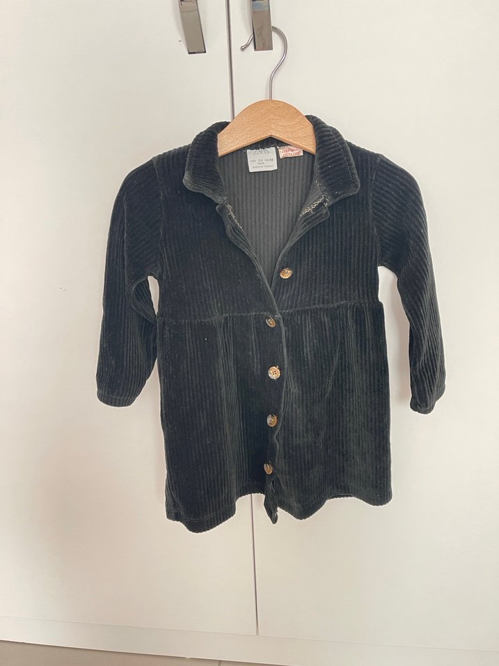 Düğmeli, siyah kadife kız elbisesi, uzun kollu ve yaka detaylıdır. Salaş kesimi ve desensiz şıklığıyla dikkat çeker.