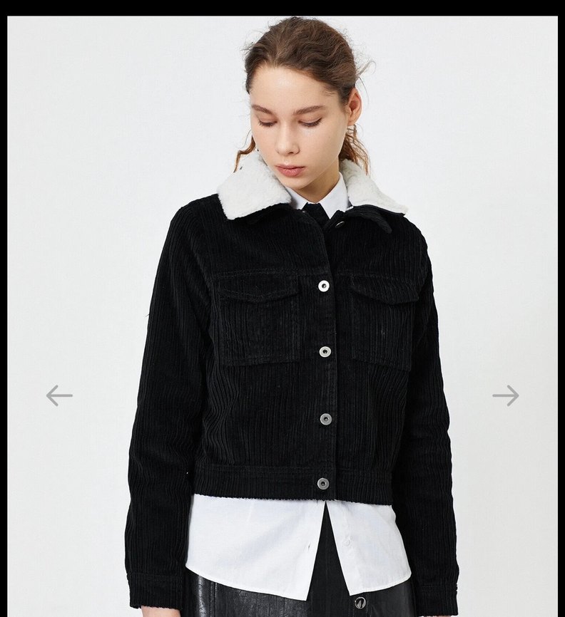 Siyah kadife düğmeli ceket, uzun kollu ve kesik yaka detaylıdır. Midi boy ve bol kesimdir, günlük rahat kullanıma uygundur. Yakasında kürk detayı vardır isteğe bağlı çıkarılabilir