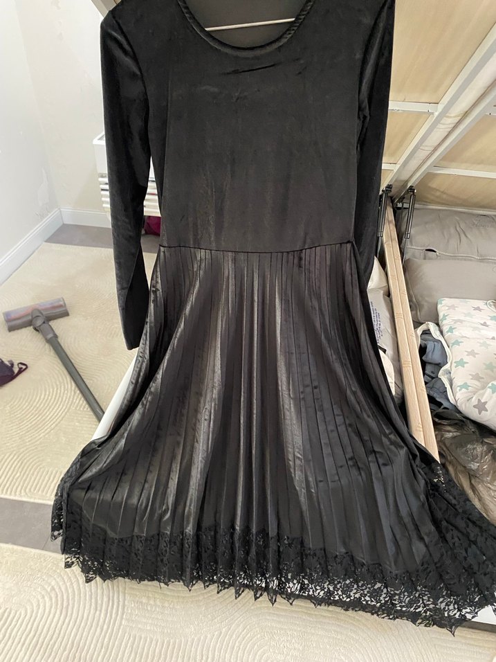 Siyah, uzun kollu ve yüksek yakalı, vücuda oturan bu uzun elbise; pilili etek ucu dantel detaylıdır. Sentetik kumaştan yapılmış, gotik tarza uygundur.