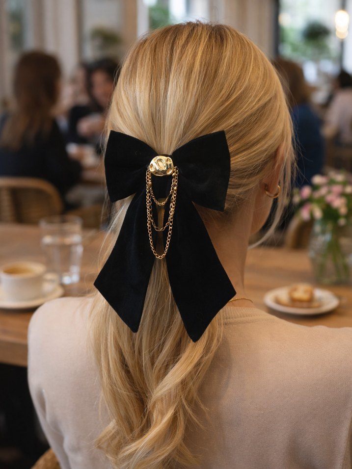 Siyah kadife fiyonk saç aksesuarı, parlak altın renkli saten detay ve zarif altın zincirlerle Paris tarzı gotik ve klasik şıklığı birleştiriyor. El emeğidir