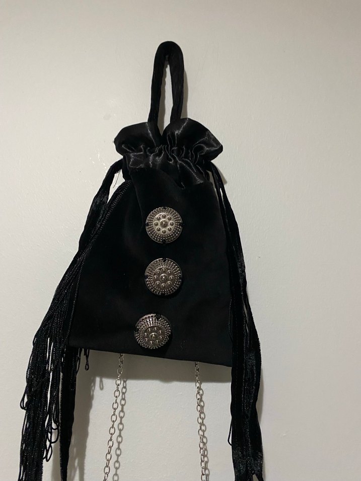 Siyah süet gotik çanta, nakışlı detaylar ve püsküllerle süslenmiş, metal düğmeler parti için uygun.