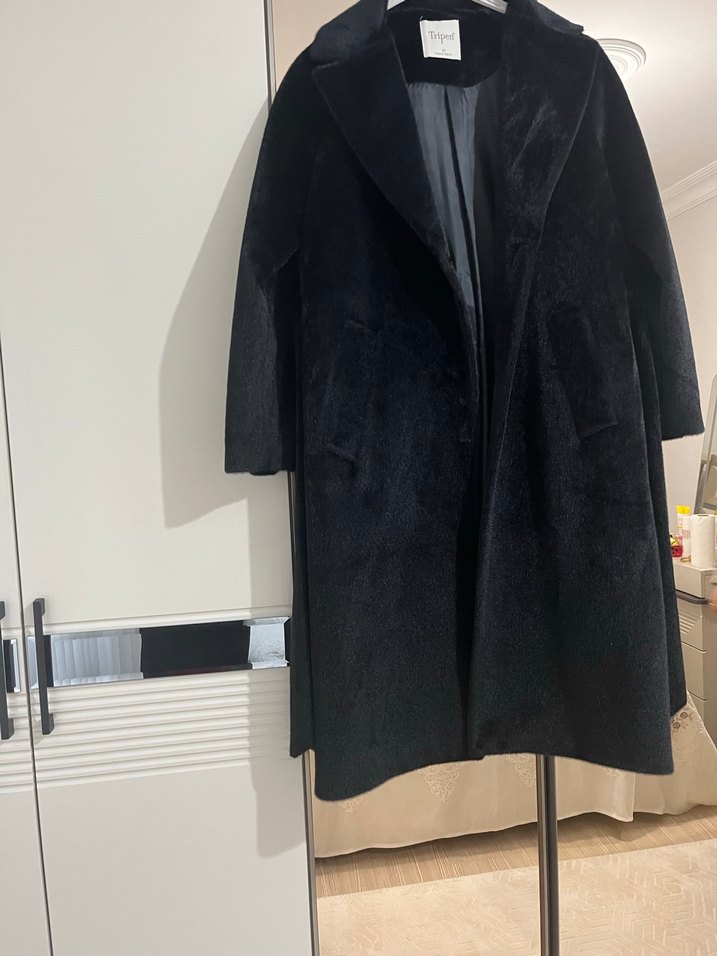 Yumuşak dokulu siyah kadife kaban, klasik uzun kesime sahip ve iç kısmı rahatlık için astarlıdır.