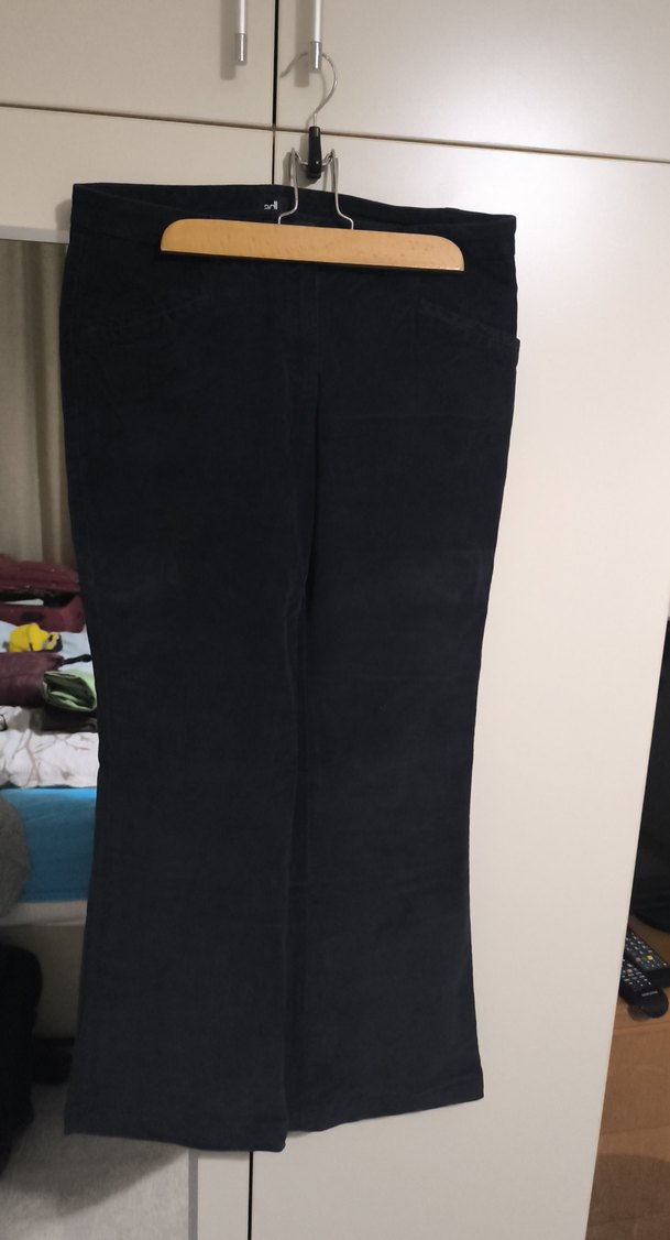 Siyah kadife kumaştan, midi boy ve dar kesim olan bu pantolon, goth tarzı ve athleisure havasıyla ofis için rahat ve şık bir seçenek sunar. sorunu yok. kesimi geniş 40 bedene de rahat olur