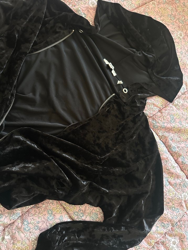 Siyah kadife, düğmeli, uzun kollu, midi uzunlukta, V yaka, bol kesim ceket. Romantik gece için gotik tarzda şık bir seçim.