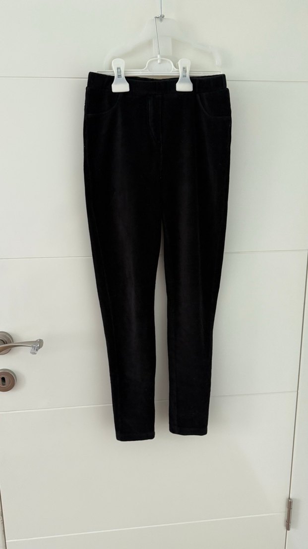 Siyah midi uzunlukta, kadife kumaştan üretilmiş, minimalist ve zahmetsiz şıklık sunan ofis için uygun pantolon tayt