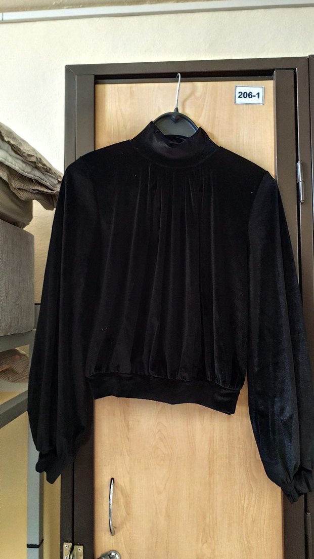 Yüksek yakalı, uzun kollu siyah kadife bluz, pileli detayları ve bol kesimiyle günlük kullanıma uygun.