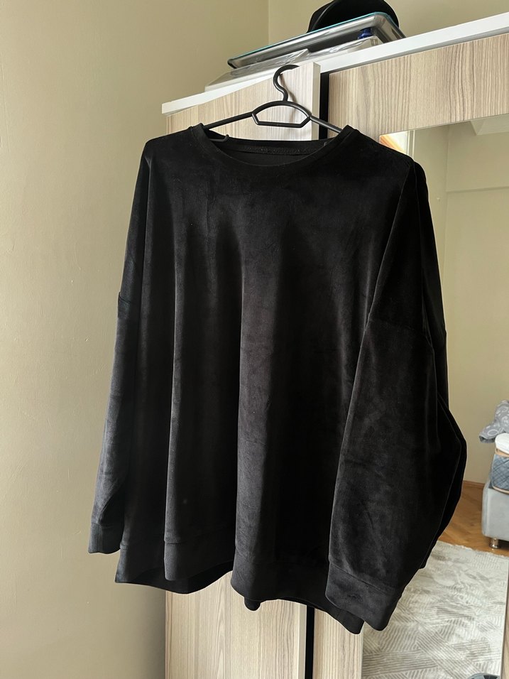 Siyah kadife kumaştan, uzun kollu ve bisiklet yaka salaş kesim sweatshirt. Midi boyda, drapeli tasarımıyla rahat ve sade goth tarzı sunar. Tertemiz yeni