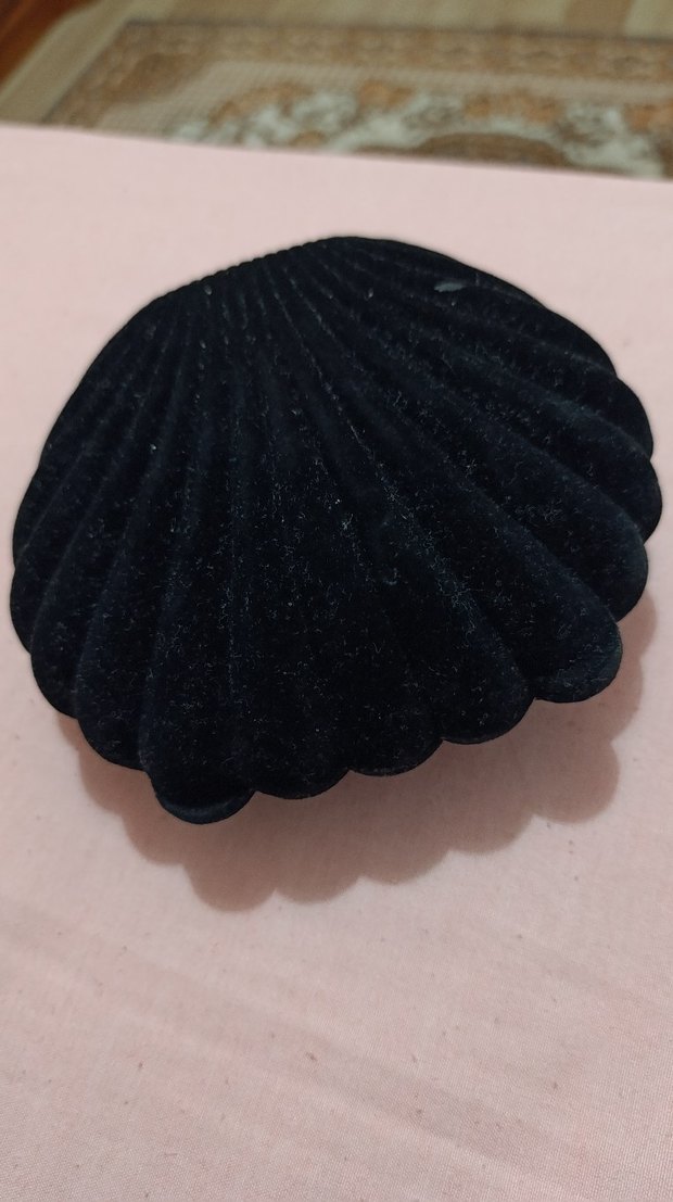 Siyah Kadife Takı Kolye Kutusu. Ürün göründüğü gibi kutunun alt ve üstündeki kadife dokusunda bazı yerlerinde hasarı var. Artık kullanmadığım için satıyorum. Üstteki hasarlı bölge inci, boncuk tarzı yapıştırılıp kapatılabilir.
