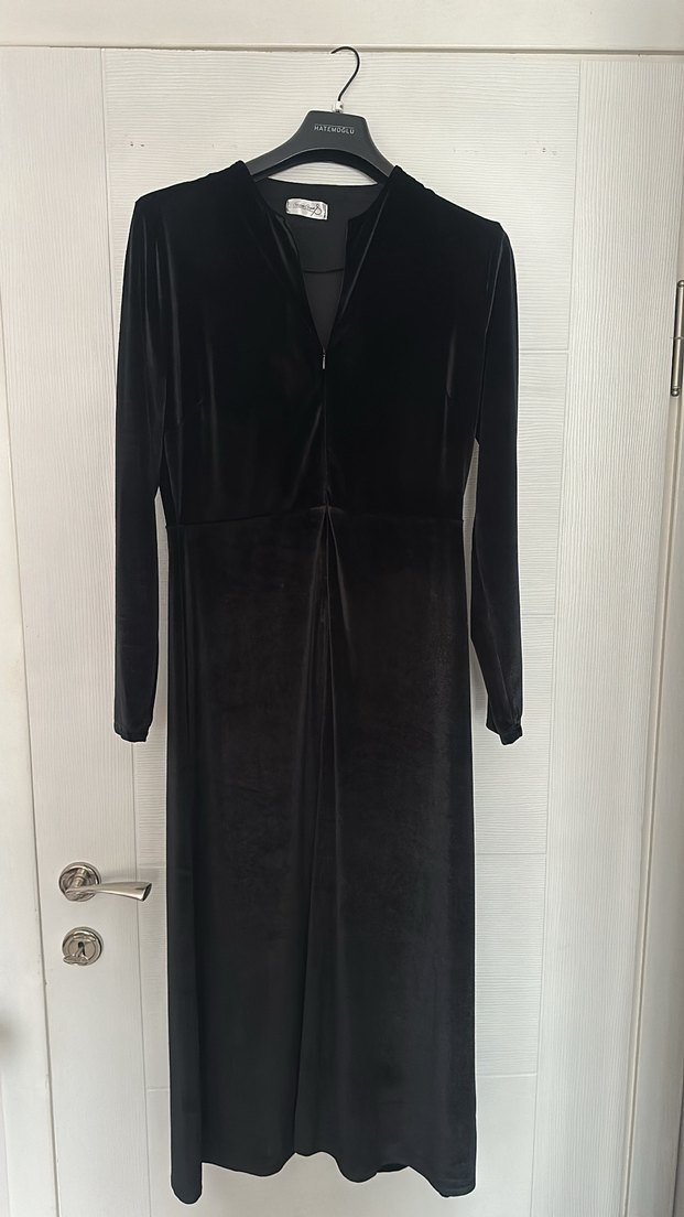 Siyah süet uzun elbise, V yaka ve uzun kollu olup, drapeli tasarımı ve regular kesimi vardır. Desensiz ve koyu renklidir, ofis için uygundur.