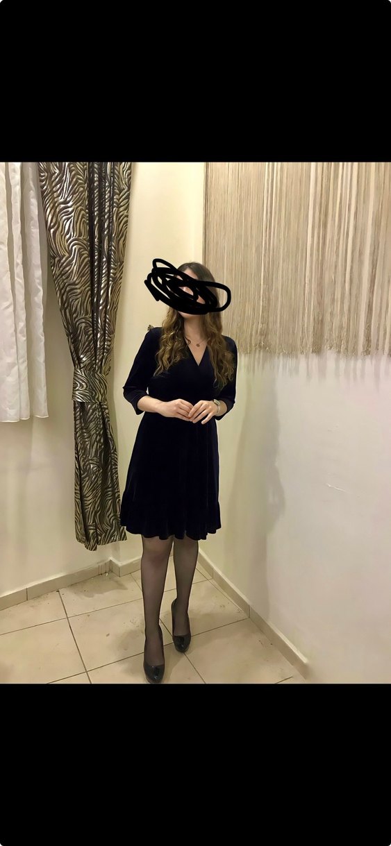 Siyah kadife kumaştan, V yakalı ve uzun kollu, kemerli bel detayıyla şık ve oturan midi elbisedir. Trendy ve romantik akşamlar için uygundur. M l bedene olur
