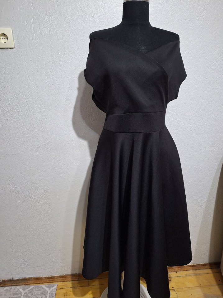 Midi boy siyah elbise, Kruvaze yakadır. Kumaşı esnekdir. Bir kez giyildi. 40-42 beden uyumludur.