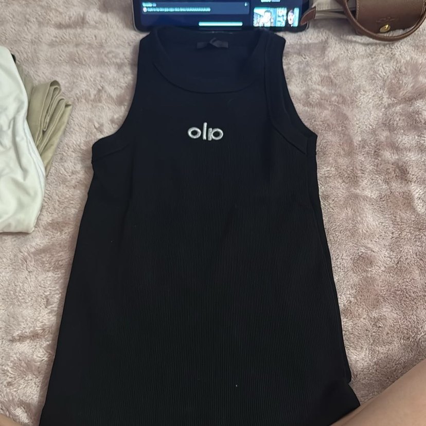 Siyah, kolsuz, midi boyda, düz kesim ve yuvarlak yakalı kadın atlet. Önünde "alo" baskısı bulunur, rahat ve şık bir görünüm sunar.
