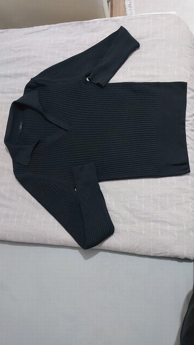 Siyah, balıkçı yaka ve uzun kollu, vücuda oturan kadın triko kazak. Örgü görünümlü sentetik kumaştan yapılmış, midi boyda ve desen içermeyen sade tasarım.