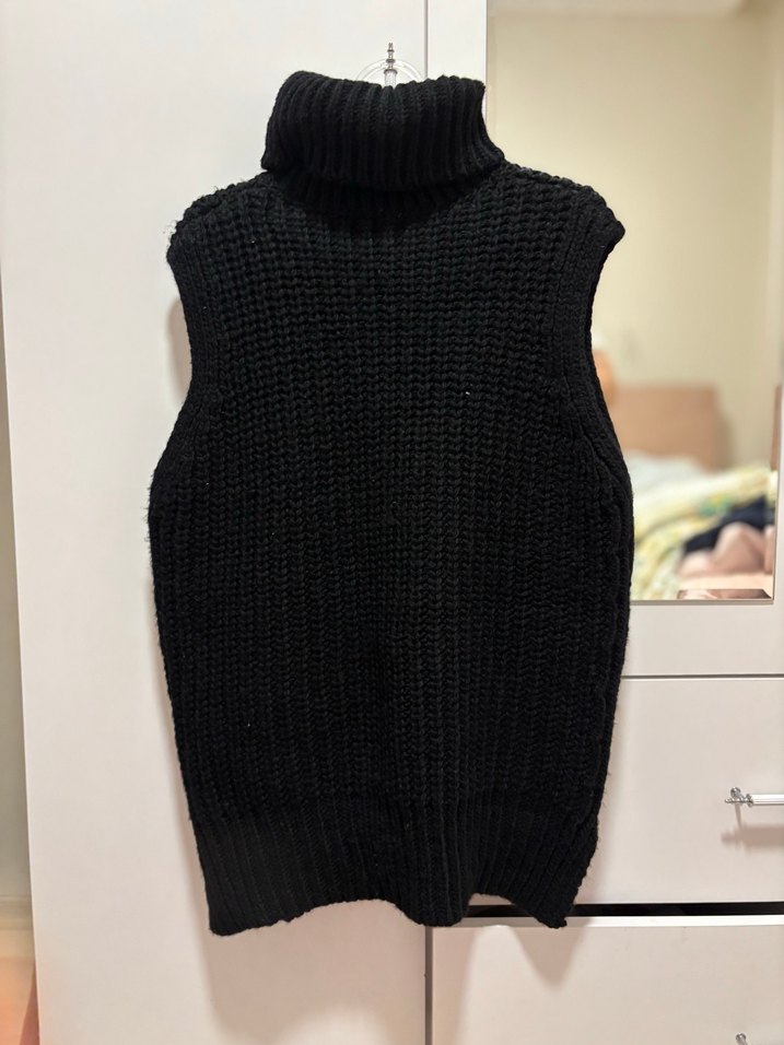 Siyah, balıkçı yaka, örme dokulu, kolsuz, normal boy triko süveter. Rahat ve şık günlük kullanıma uygundur.