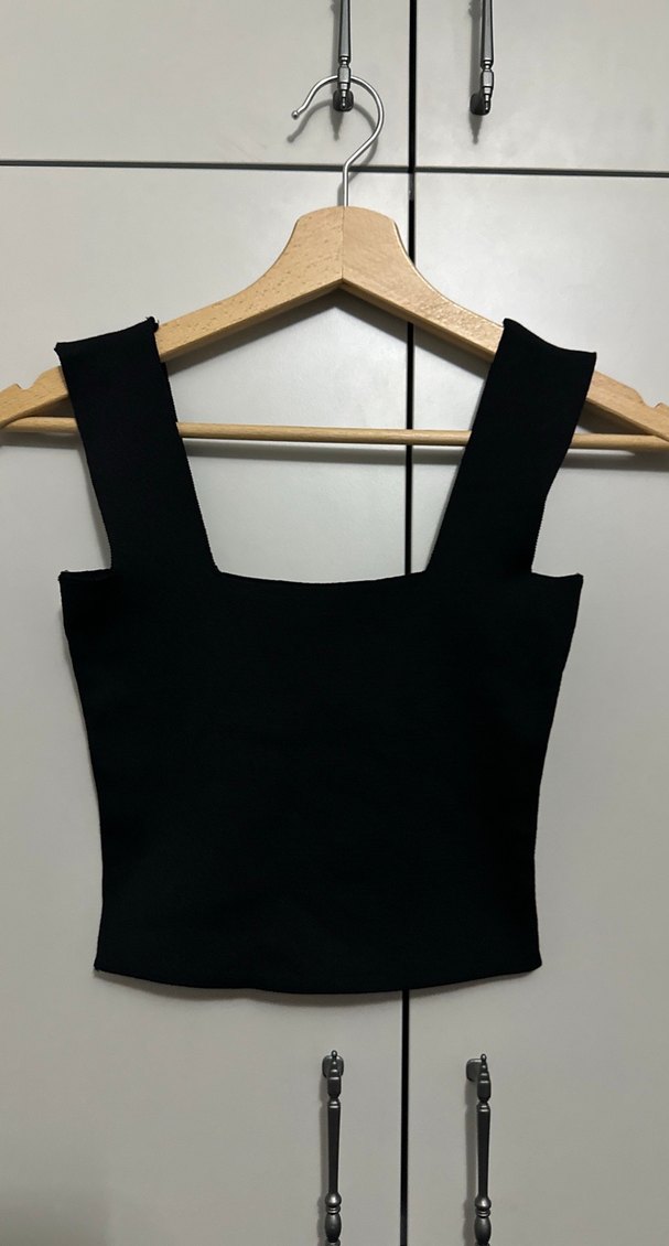 Düz siyah, askılı ve düz yakalı kadın üstü. Sentetik kumaştan, sade ve şık, günlük kullanım için uygun.xs ve s beden için uygundur
