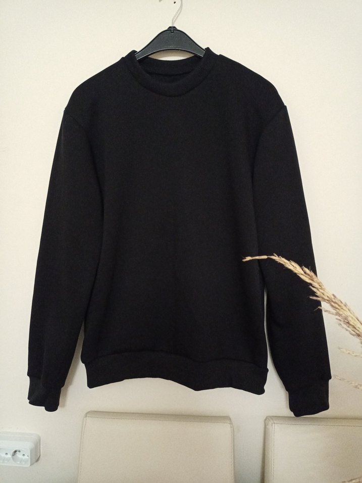 Siyah renkte, yuvarlak yakalı ve uzun kollu, bol kesim kadın sweatshirt. Yumuşak dokusu ve sade deseni ile günlük rahatlık sunar. eni 54, boyu64, kolboyu65,