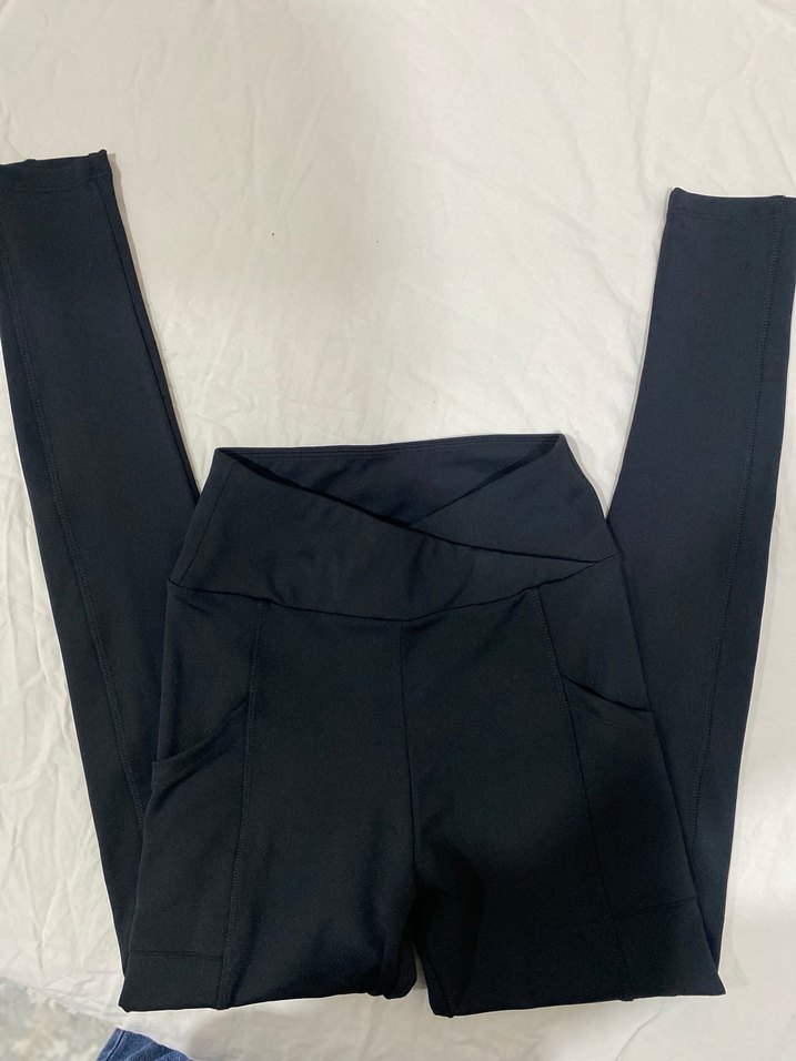 Siyah, elastik bel bantlı, düz kesim kadın taytı, yumuşak sentetik kumaştan günlük kullanıma uygun.