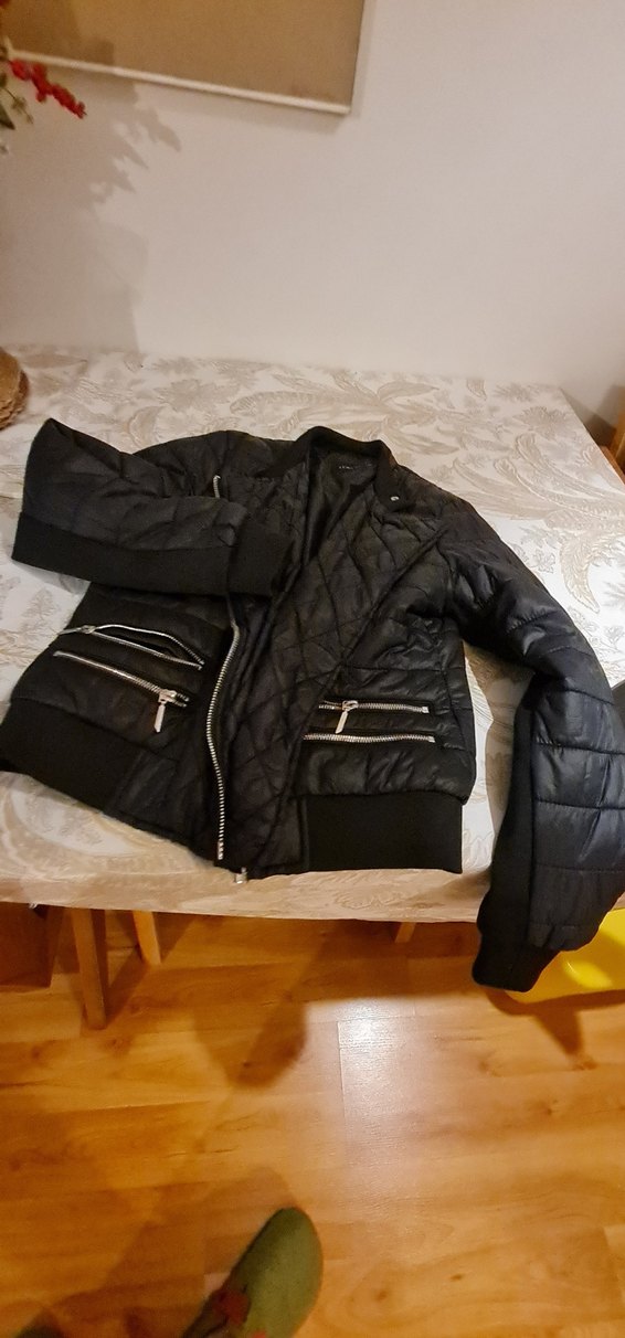 Siyahi, biker ceket; çıtçıtlı yakası, fermuarlı cepleri ve askılı kolları ile kısa boyda. Günlük ve sokak stili için uygundur.