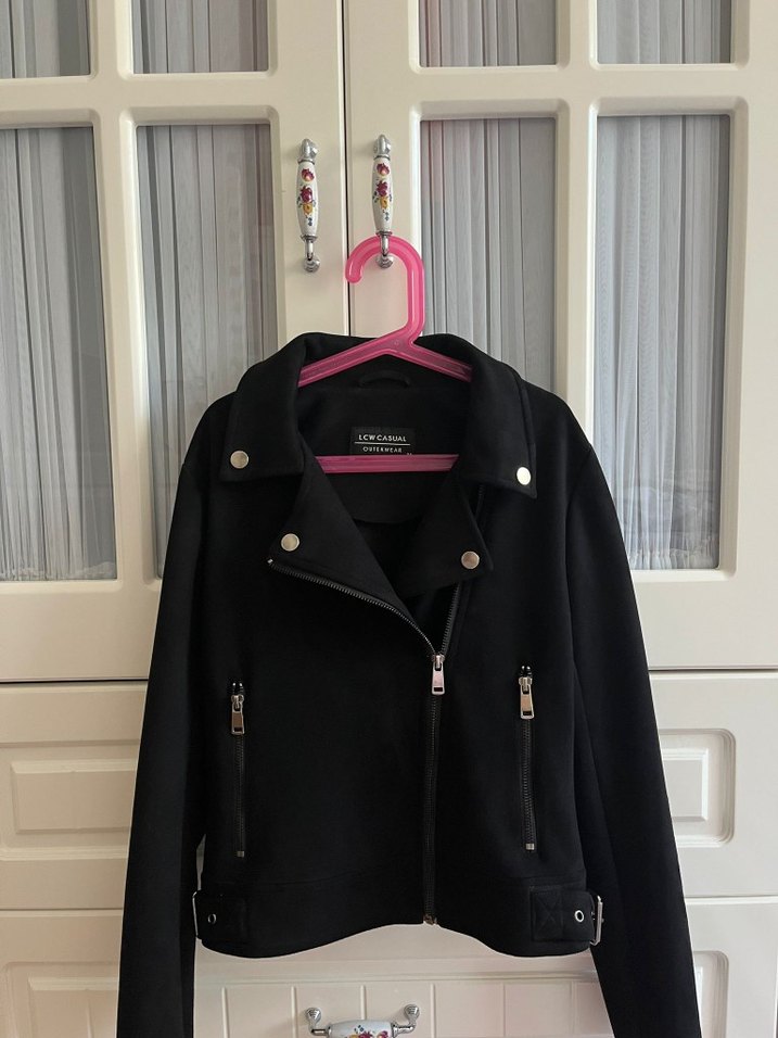Siyah, fitted kesim kadın biker ceketi. Fermuarlı cepler ve kesik yaka detaylı, yumuşak kumaştan yapılmıştır. Günlük kullanım için uygundur.