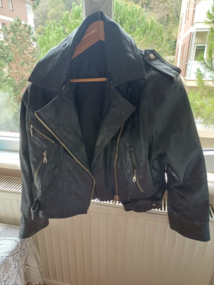Siyah renkli, bel detaylı ve notched lapel yakalı kadın biker deri ceket. Strappy kollu, fitted kesim ve midi boyda, grunge punk tarzı sunar. Günlük kullanıma uygun.