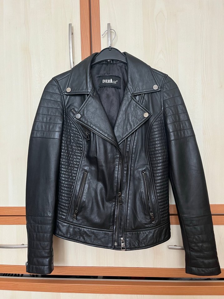 Siyah deri biker ceket, kesik yakalı ve tokalı detaylara sahip. minimalist tasarımlı, günlük kullanıma uygun az kullanıldı bana dar geldiği için satıyorum