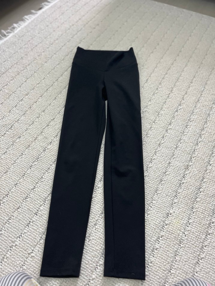 Siyah, bilek boyu, vücuda oturan kadın taytları, düz ve yumuşak sentetik kumaştan, günlük kullanım için rahat ve şık.