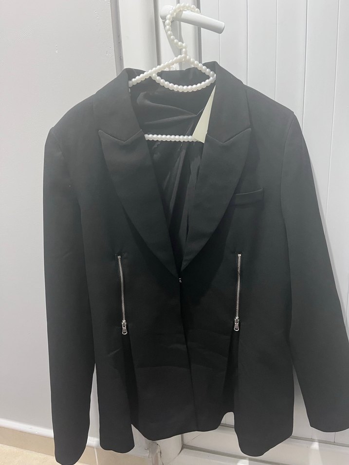 Siyah renkli, notched yakalı kadın blazer. Fermuarlı cepleri, satenimsi dokusu ve strappy kollu, midi boyda rahat kesim bir tasarım. Ofis için goth tarzında.