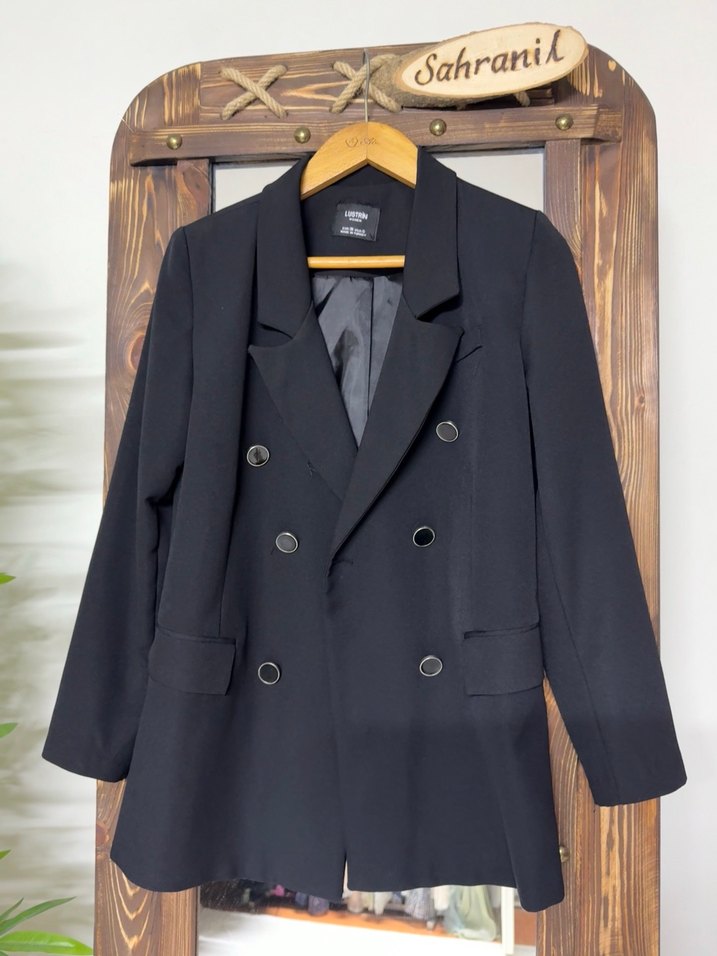 Siyah kadın blazerde kesik yaka ve düğmeli ön detaylar bulunur.sıkıntısız bir ya da iki kez özel günde kısa süreliğine kullanıldı .S/M beden için uygundur.