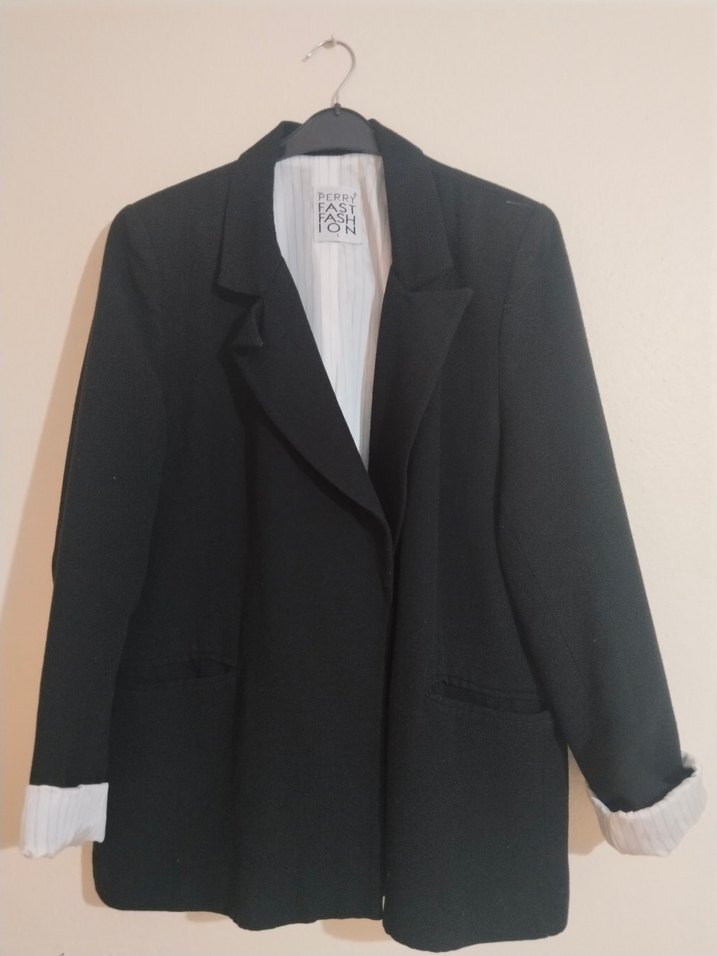 siyah kadın blazer ceket. Notch yaka, uzun kollu ve midi boydadır. Ofis ve sokak stiline uygundur. etek uzerine cok uygun ama tuhlenme problemi var ve uzerjnde beyaz bir cizgi var omuz kısmında fotoğraf ekledim