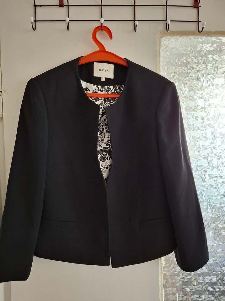 siyah kadın blazer ceket, notalı yaka ve uzun kollu. Sentetik kumaştan, ofis için uygun, klasik ve şık tarzda.