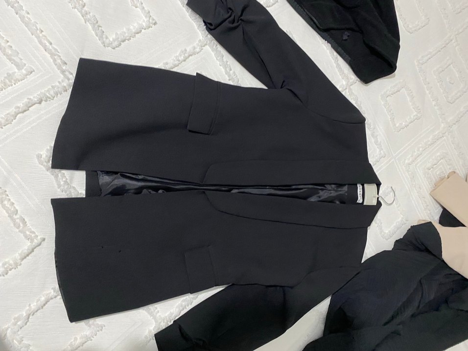 Siyah,, notched lapel yakalı kadın blazer ceket. Sentetik kumaştan, regular fit ve yırtmaç detaylı, ofis stiline uygun.