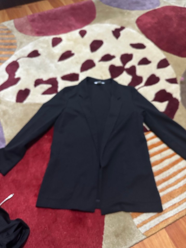 Uzun kollu, siyah kadın blazer ceket, normal kesim ve yakalı. Ofis kullanımı için uygun, desensiz ve şık tasarım.