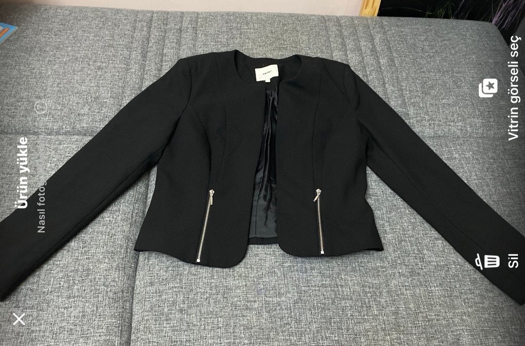 Fermuarlı cepleri ve kesimli yapısıyla siyah kadın blazer. Sayılı giydim kalitesi harika yepyeni