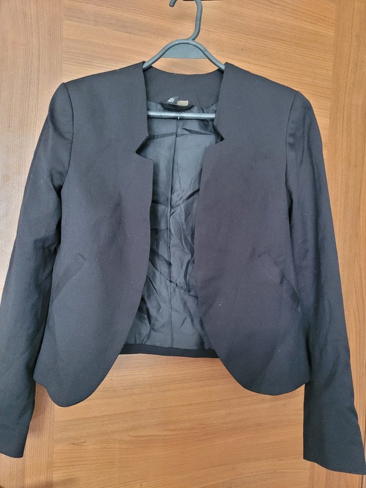 siyah kadın blazer ceket, çıtçıt yakalı ve uzun kolludur. Normal boyda, sentetik kumaştan üretilmiş, ofis kullanımı için uygundur.