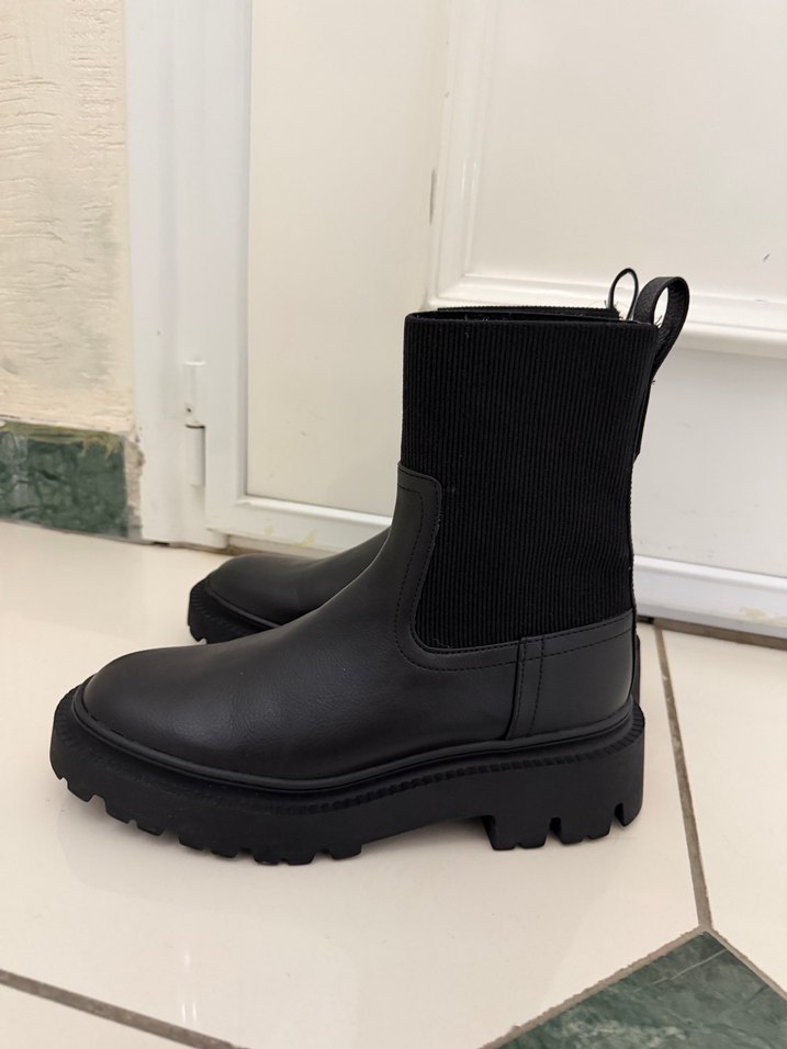 Siyah kadın bot, blok topuklu ve kauçuk tabanlı, tokalı tasarıma ve rahat örme üst kısma sahiptir. Günlük kullanıma uygun, rahat normcore tarzda.