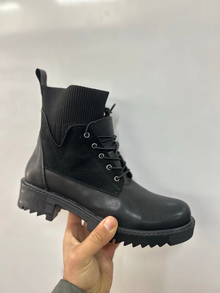 Siyah, blok topuklu ve kemerli tasarıma sahip kadın botları. Kauçuk malzemeden üretilmiş, gotik tarzda günlük kullanıma uygun şık ve rahat botlar.