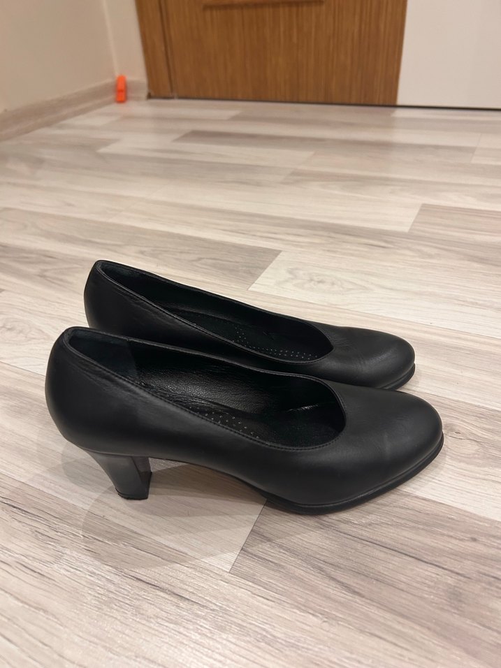 Siyah, kauçuk blok topuklu kadın stiletto. Minimalist, düz tasarımlı ve ofis kullanımı için uygun. Zahmetsiz şıklık sunar. Sadece bir kez giyildi iç ve dış hakiki deridir
