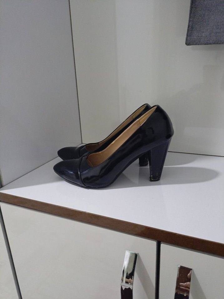 Siyah, kauçuk blok topuklu kadın stiletto. Klasik ve modern tarzda, ofis için uygun, zahmetsiz şıklık sunar.