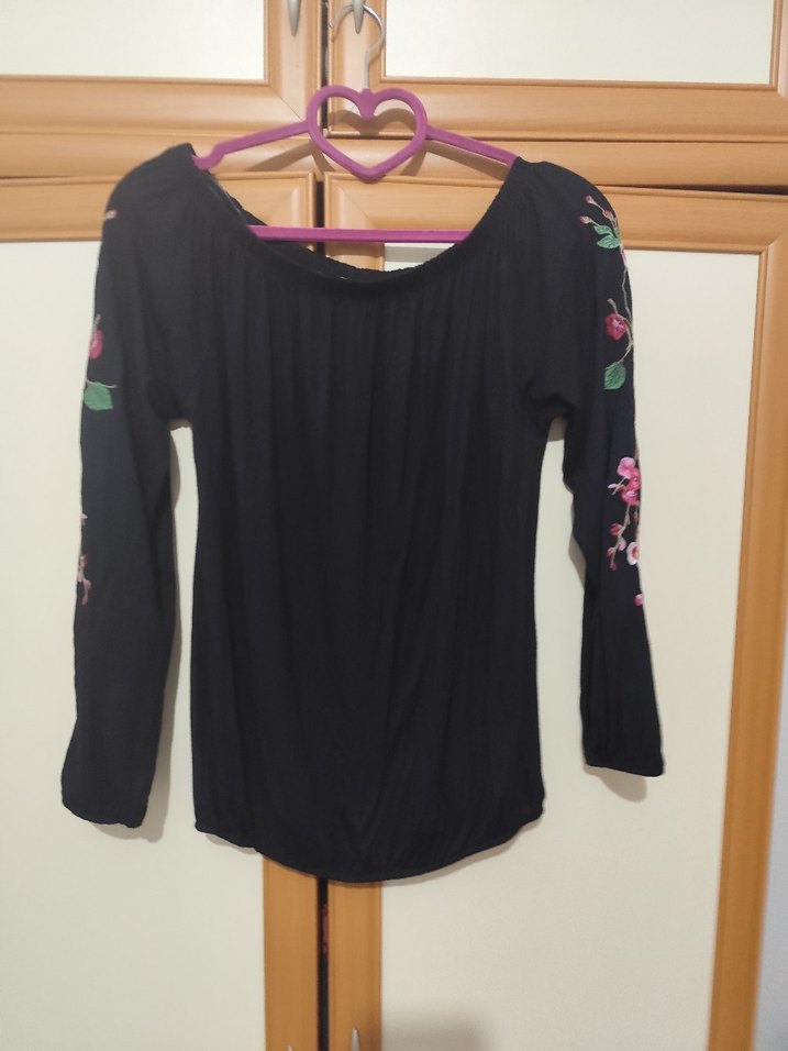 Uzun kollu, kayık yaka siyah kadın bluz, çiçek desenli detaylara sahip, salaş bohem tarzda.